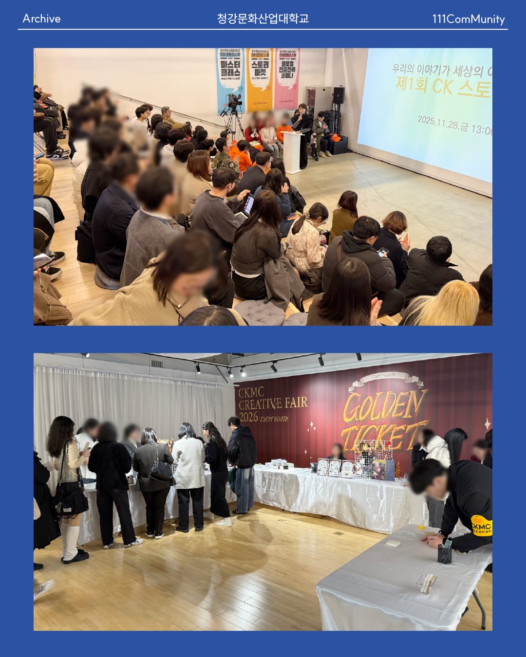 11월 28일부터 30일까지, 복합문화공간 111CM에서 청강문화산업대학교 만화콘텐츠스쿨 졸업작품전 <CKMC 크리에이티브페어 2026 - "골든 티켓">이 열렸습니다.