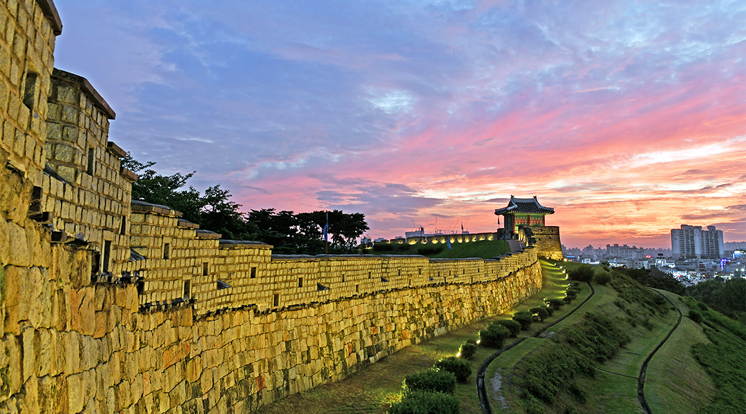 水原華城は水原の中心に位置しており、長さは約5.7kmで城郭に沿って散策路が作られています.水原華城の風情の楽しみ方は様々です.親孝行で民を深く愛していた正祖大王の足跡に沿って城郭をゆっくり歩いたり、土木建築の白眉である丁若鏞(チョン・ヤギョン)の優れた科学性に注目して見るのもおすすめです.ただ歩くだけで輝かしい芸術性と美しい景観が満喫できる場所、どこから歩き始めても一つにつながる道の上で異色の風情をお楽しみください.