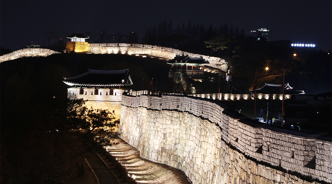 昼間よりさらに美しくなる水原華城の夜、韓国観光公社「夜の観光地100選」。都心の中にある美しい宮殿の夜景や、文化財観覧の深みと余裕が楽しめます。