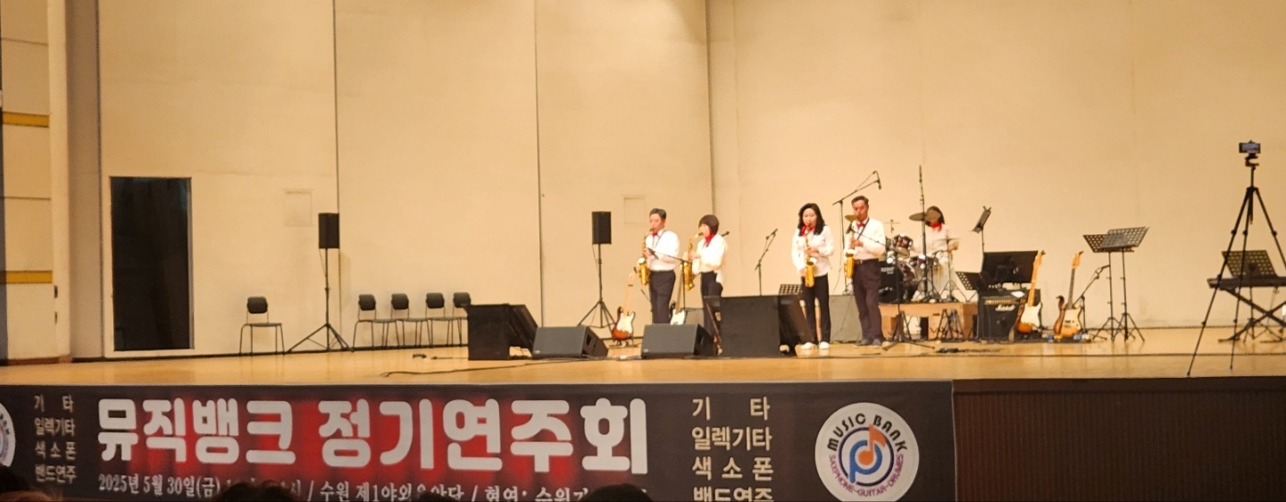 뮤직뱅크 음악동호회는 색소폰,통기타,드럼,밴드 등 4개의 팀으로 구분하여 활동하고 있습니다.