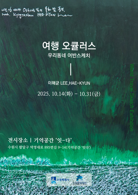 10월 14일부터 10월 31일까지 열리는 이 전시에서는 수원의 원로작가 및 문화예술교육자로서 활발한 활동을 하고 있는 서양화가 이해균의 어반스케치 작품 수백 점과 그가 수집한 다양한 여행 소품들을 다채롭게 만날 수 있다.