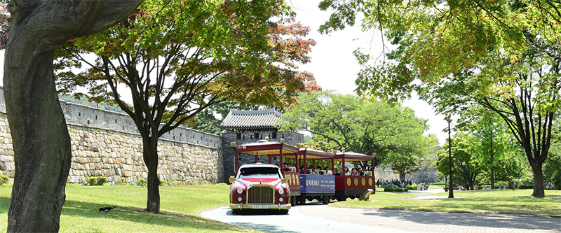 ‘화성어차’는 수원화성을 순환하는 테마 관광 열차로, 조선시대 국왕의 가마와 순종이 타던 자동차를 모티브로 디자인됐다. 주행속도는 시속 약 20km 내외다. 화성어차 운행은 한국어 해설 서비스는 기본, 좌석마다 비치된 오디오 시스템을 통해 영어, 중국어, 일본어 설명을 들을 수 있다. 단, 이어폰은 별도 지참한다.